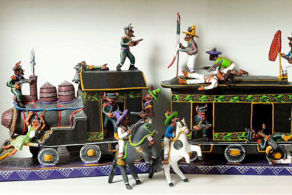 Las escenas religiosas no dejan de estar presentes, con representaciones de la última cena o altares con las apariciones de a virgen de Guadalupe. Otra temática interesante es la relacionada con las escenas de la vida cotidiana de México mezcladas con personajes fantásticos, como este tren de diablitos, realizado por la maestra artesana Esperanza Felipe Mulato.