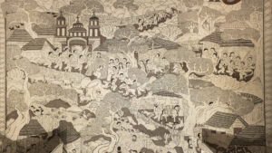 El gran mural de papel amate envuelve el nacimiento de barro realizado en San Agustín Oapan, Guerrero. En ellos se relata la historia de la Navidad dentro del imaginario mexicano: paisajes, personajes, animales como un camello, un elefante y una iguana, y plantas como el cactus.