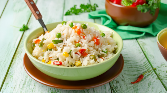 En una olla, calentar el aceite y añadir el arroz junto con la mitad de la cebolla y los ajos picados. Sofreír por unos minutos hasta que el arroz tome un color dorado ligero.