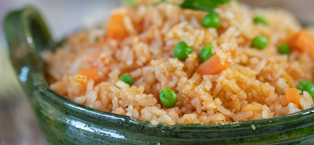 El arroz rojo servido como entrante o primer plato, suele acompañarse por plátano o huevo frito.