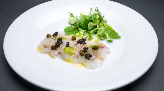 Verter la mezcla de zumos sobre los langostinos y añadir sal, pimienta rosa y las supremas de naranja. Formar pequeñas esferas con la crema de aguacate, añadir vinagre balsámico al gusto, las huevas de tobiko y las semillas de mostaza. Decorar con brotes de cilantro y acompañar con totopos de maíz o pan de pipas.
