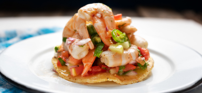 – En un plato colocar las gambas con el jugo y encima poner las gambas de naranjas, el cilantro, las semillas de sésamo, el puerro frito y degustar con los totopos.