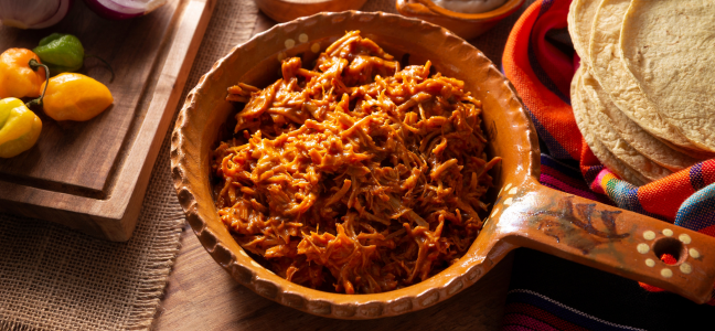 4. En una olla u sartén profundo, calentar un poco de manteca o aceite. Añadir la carne deshebrada y verter la salsa de guajillo. Mezclar, rectificar de sal y cocinar 10–15 minutos a fuego medio, hasta que se integren sabores.