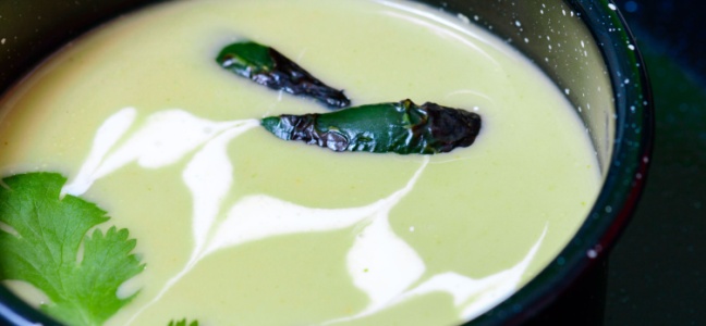 Licuar la leche evaporada, el queso crema y la crema agria junto con la mezcla de chiles hasta obtener una crema homogénea.