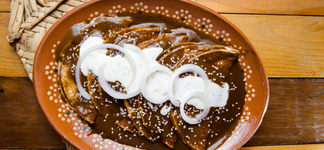 Cubrir con la salsa poblana, agregar queso gouda y gratinar en horno a 200 °C por 10 minutos.