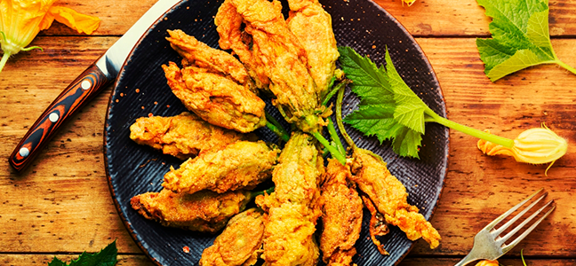 – Rebozar las flores de calabaza rellenas en esta mezcla, freír en aceite y reservar.
