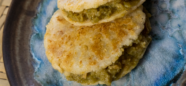 – Retirar del fuego, picar el guiso de chicharrón e introducirlo en cada gordita.