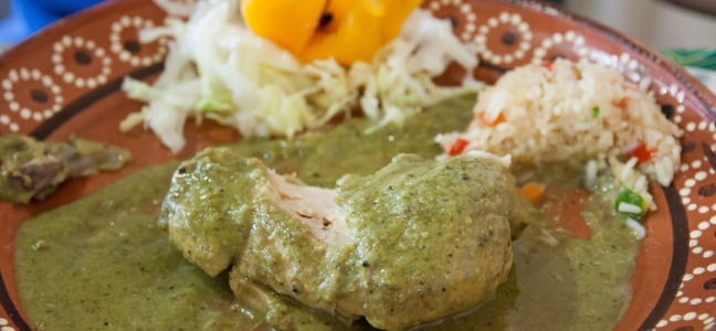 – Moler en la licuadora el tomate verde crudo con agua y agregar a la salsa en la cazuela, dejar que de un hervor y añadir el lomo de cerdo previamente cocido y cortado en rebanadas.