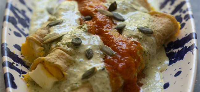 6. Servir los tacos y bañar con la salsa de Papadzul y la salsa de tomate encima.