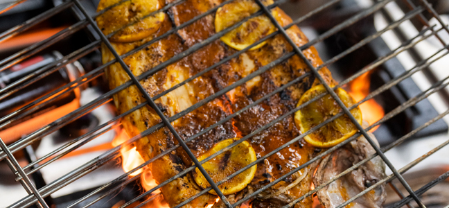 Si se prepara en la parrilla, colocar el pescado abierto y barnizado por ambos lados, colocando también las rodajas de limón dentro de la rejilla. Asar dando vueltas (zarandear) para evitar que se queme el pescado.
