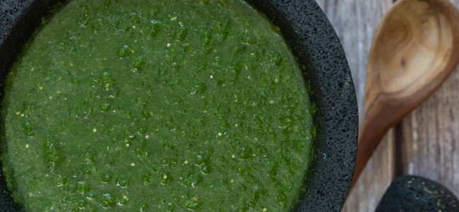 – Puede utilizarse también un molcajete o mortero de granito para triturar o machacar manualmente, lo cual aportará otra consistencia a la salsa. Se van añadiendo de a poco los ingredientes, hasta integrarlos todos.