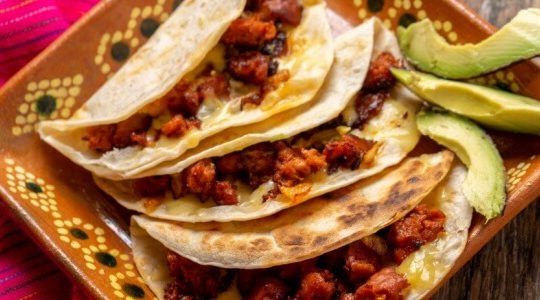 Calentar las tortillas de harina en un comal y preparar los tacos colocando la mezcla de chorizo, queso y rajas.