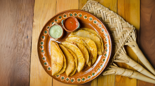 Calentar las tortillas en un comal. Rellenarlas con los guisados de papa y chicharrón.