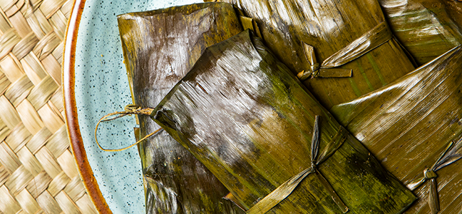 – Se pasan las hojas de plátano directamente sobre la flama durante unos segundos para que se suavicen y se pueda trabajar con ellas. Se corta una hoja grande en cuadros de 15 centímetros de lado, se engrase la parte externa con la manteca restante, sobre cada hoja se coloca un poco de masa y sobre la masa media cucharada del relleno.