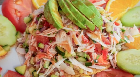 Formar las tostadas con la rúcula, la mezcla de carne de cangrejo y añadir encima los plátanos y una rodaja de aguacate.