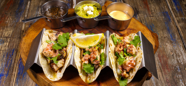 Tostadas de pulpo y patata con salsa de achiote al orégano