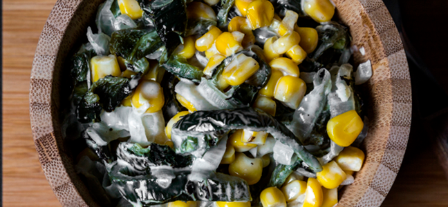 – En un sartén poner la mantequilla o manteca. Freír ligeramente la cebolla, después el ajo y por último los elotes. Una vez cocido, añadir las rajitas de poblano y la nata.