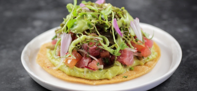 Sobre una tostada de maíz colocar mayonesa de chipotle, el atún con el tomatillo ya marinado, un poco de cremoso de aguacate y terminamos con la ensalada de cilantro y cebolla roja.