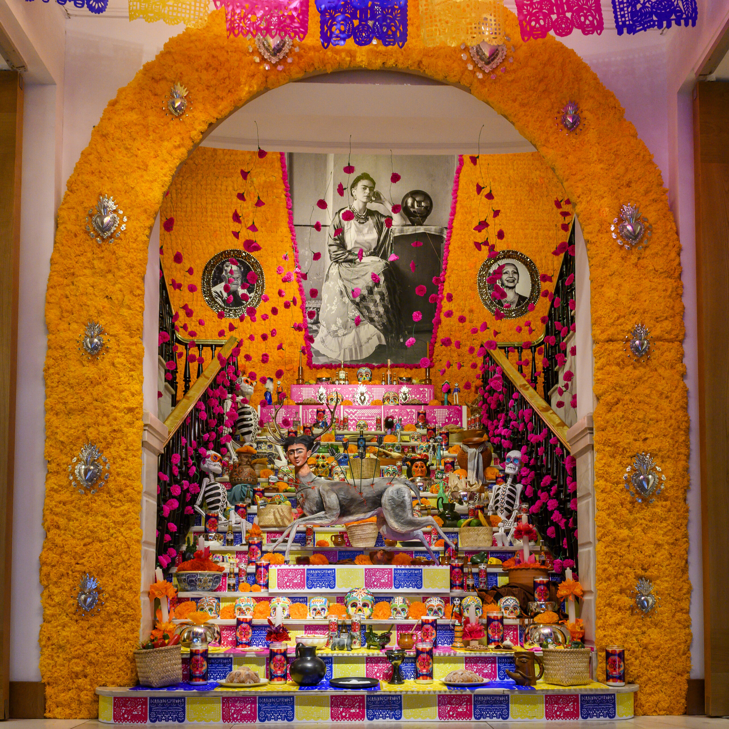 El Mega Altar 2022 está compuesto por elementos tradicionales de un altar y se complementa con piezas de arte popular mexicano: papel picado, hojalata