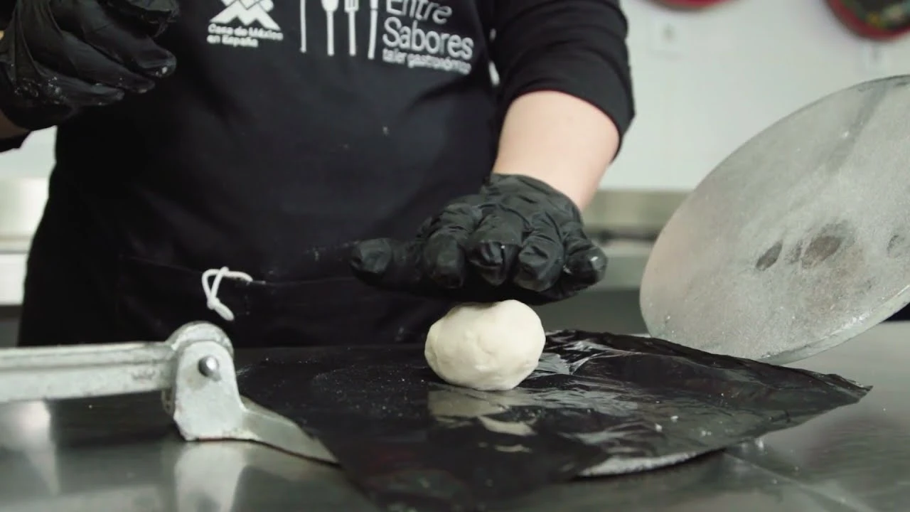- Haz una bola con la masa (harina de maíz nixtamalizado con agua).