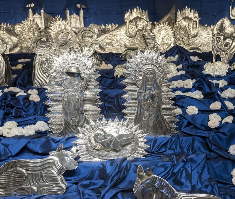 La instalación se conforma de un tradicional nacimiento (belén), un paisaje campestre en 16 metros de hojalata repujada y 39 estrellas de vidrio emplomado. También